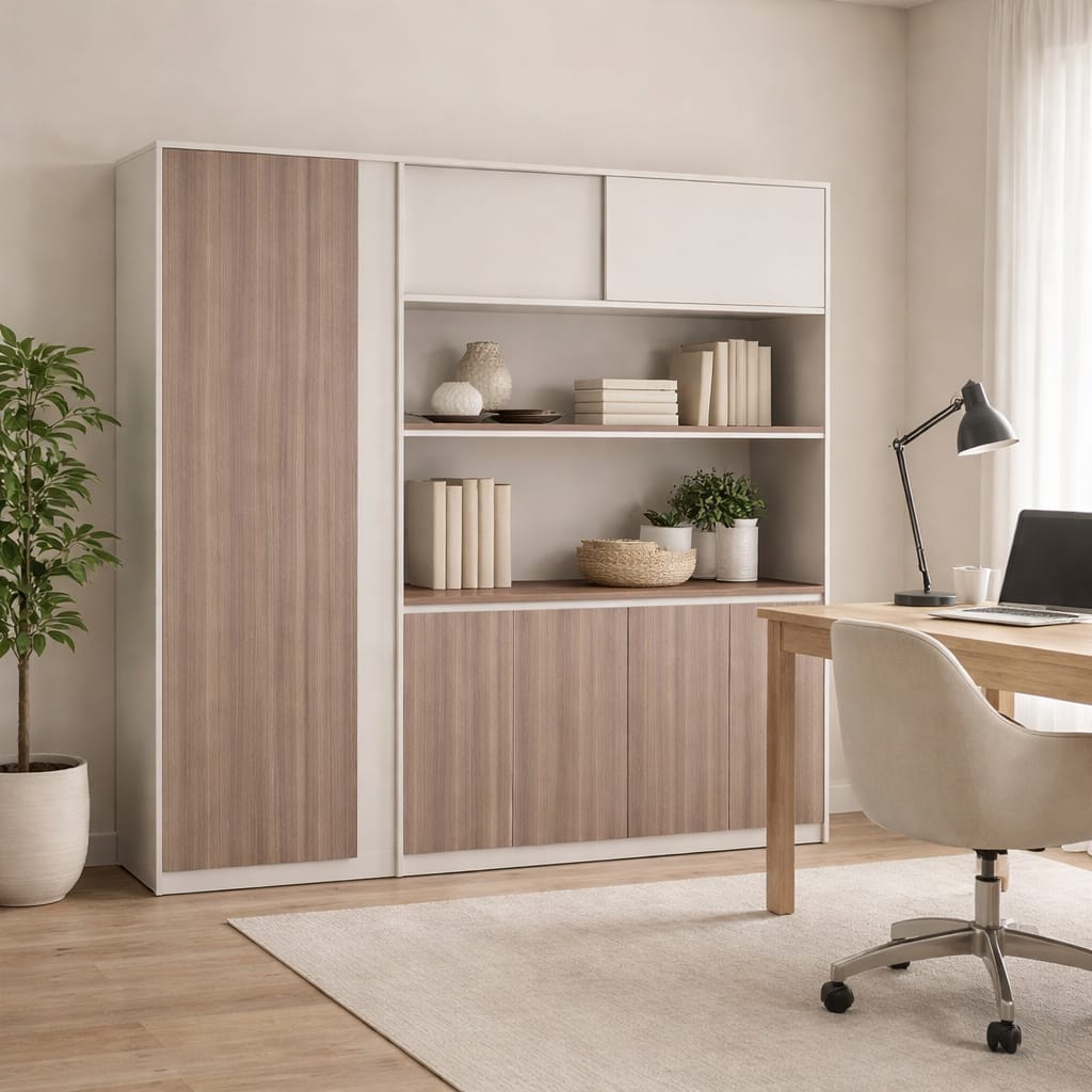 הארון משלב אחסון פתוח וסגור, ומיועד להעניק פתרון מלא ומאורגן לכל משרד הנהלה – ספרים, קלסרים, מסמכים ופריטי דקורציה.