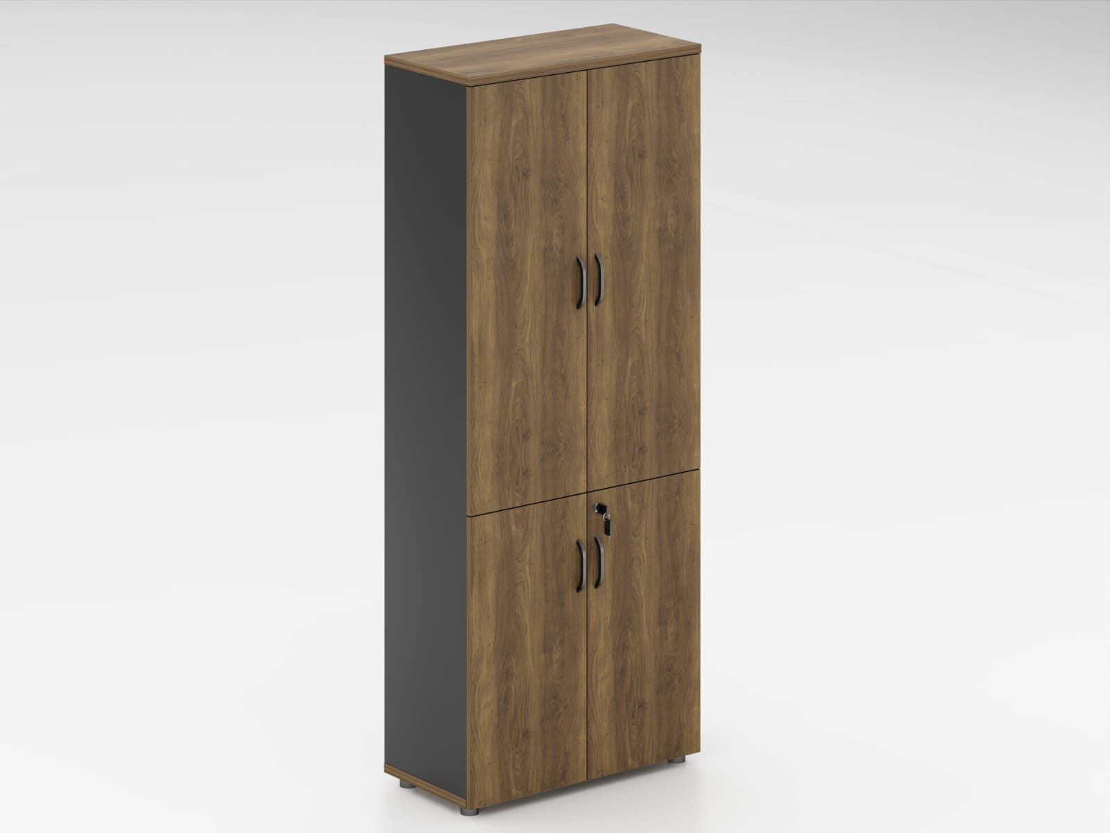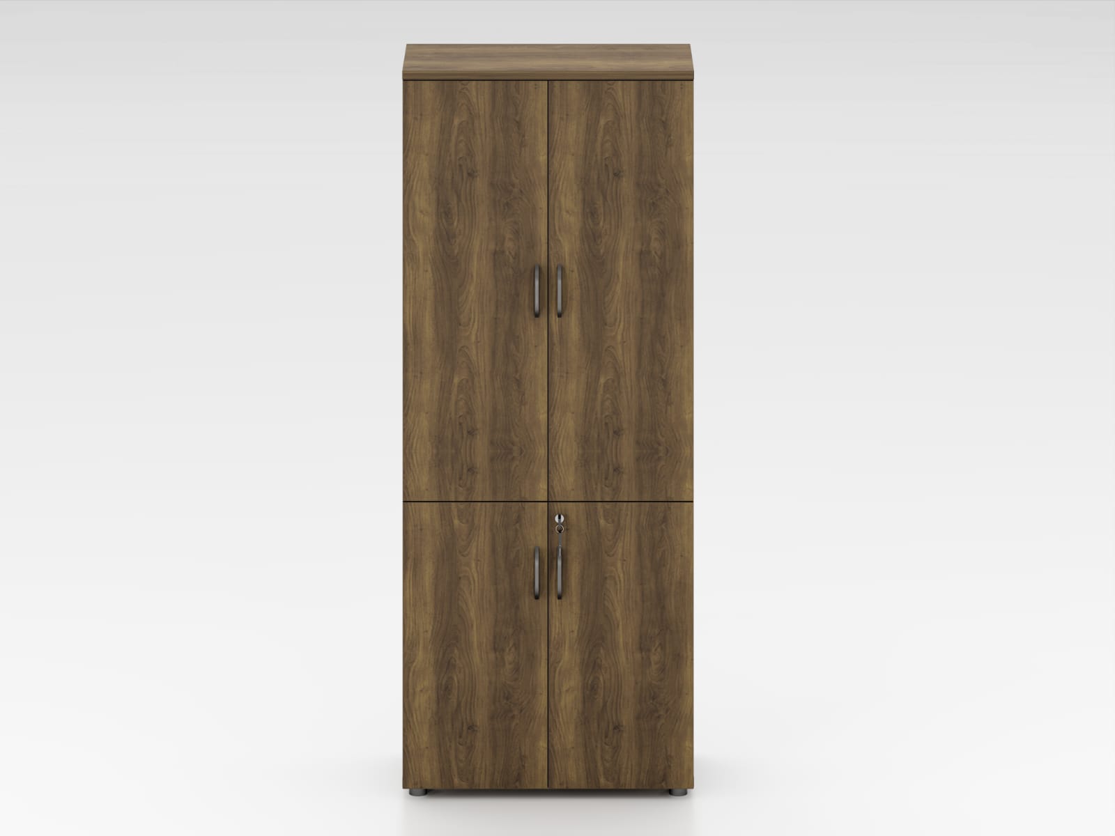 מבנה צר וגבוה עם 4 דלתות – 2 עליונות ו-2 תחתונות (כולל מנעול), מתאים לאחסון קלסרים, ניירת, ציוד משרדי ועוד.