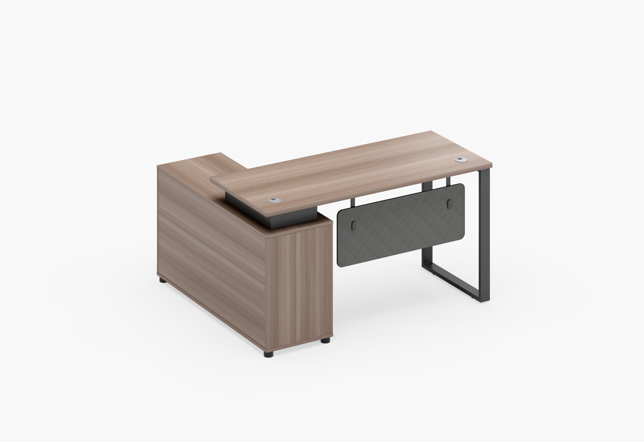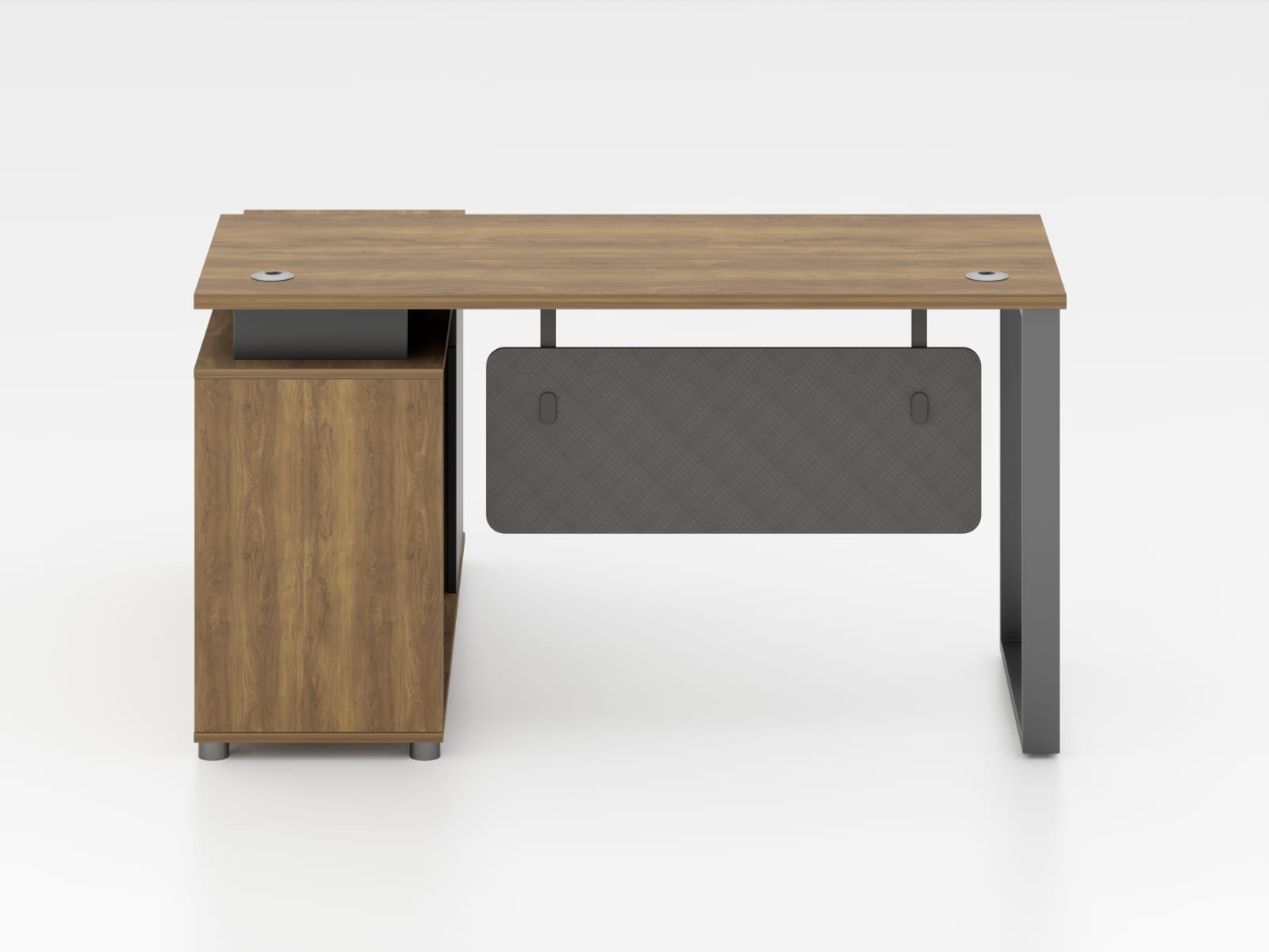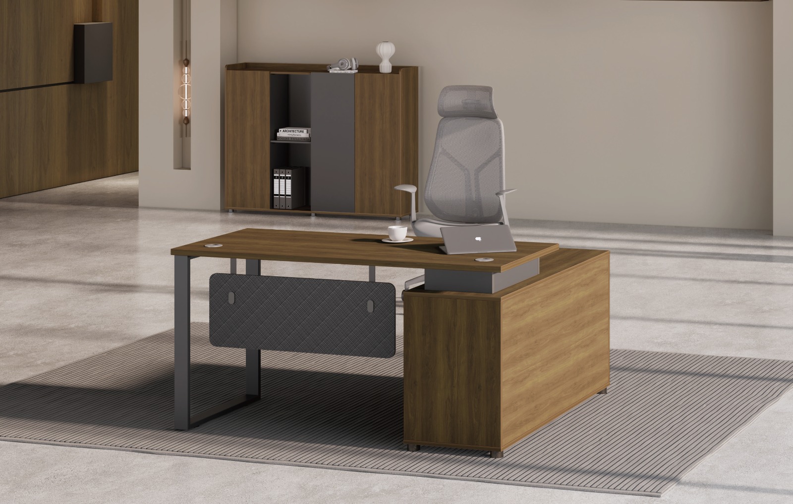 סט משרדי קומפקטי ומרשים הכולל שולחן עבודה, שלוחה צדית וארון תואם – בעיצוב מודרני עם קווים נקיים ונוכחות אלגנטית.