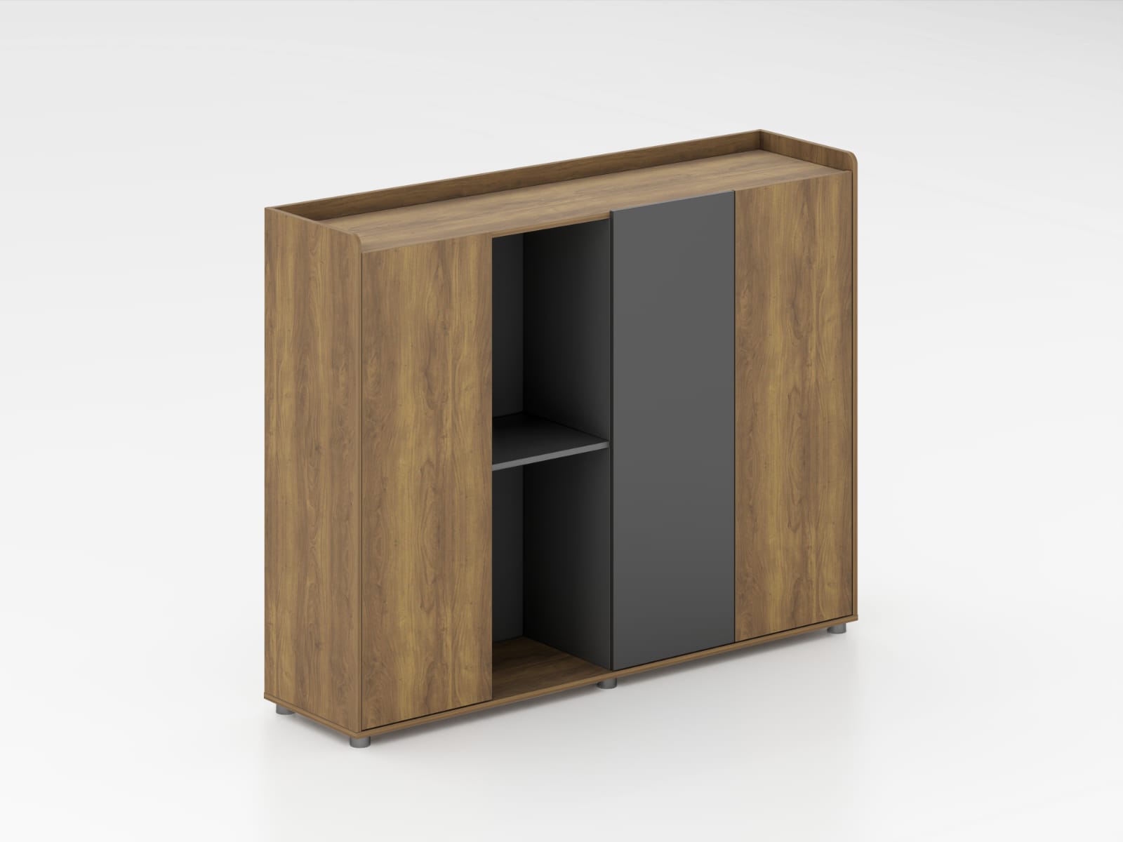 ארון תואם עם תאי אחסון פתוחים וסגורים, בעיצוב המשלים את הקו של הסט.
