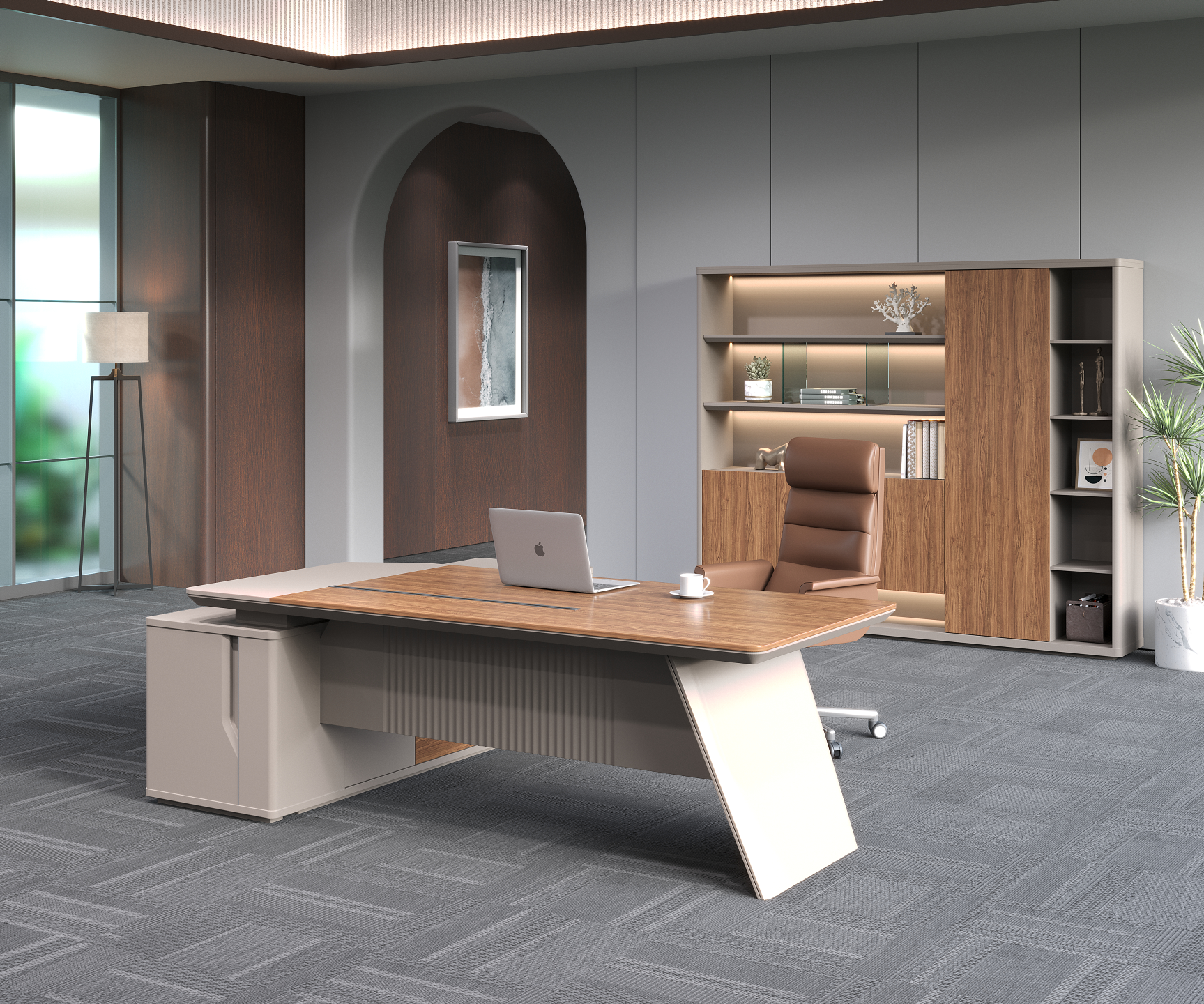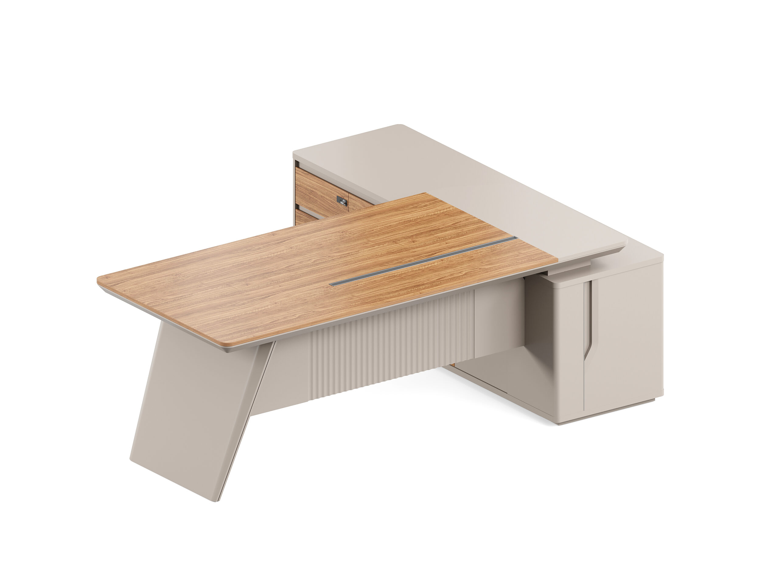 המערכת כוללת שולחן מנהלים גדול לצד ארון אחסון גבוה התואם בעיצובו לשולחן.