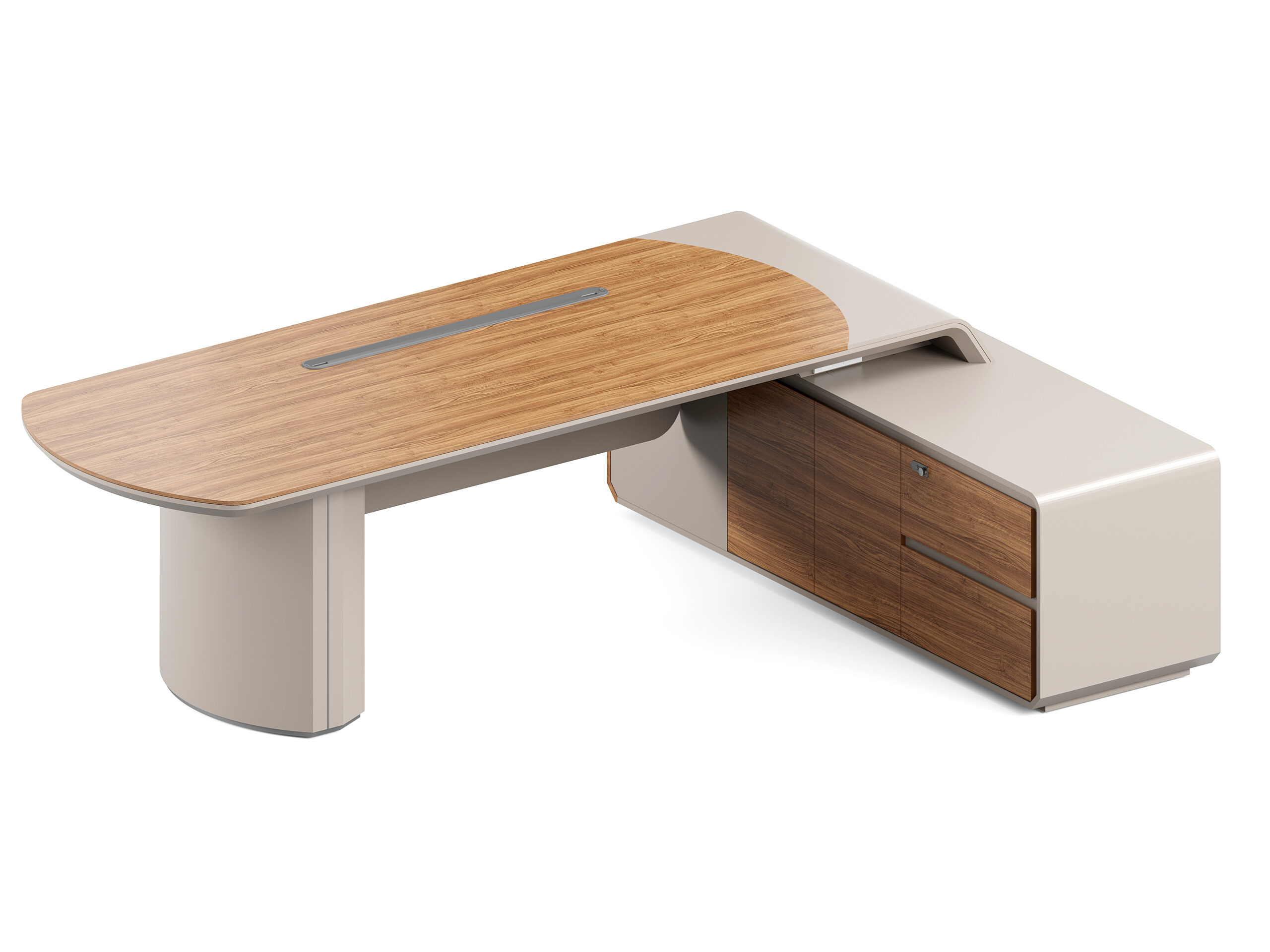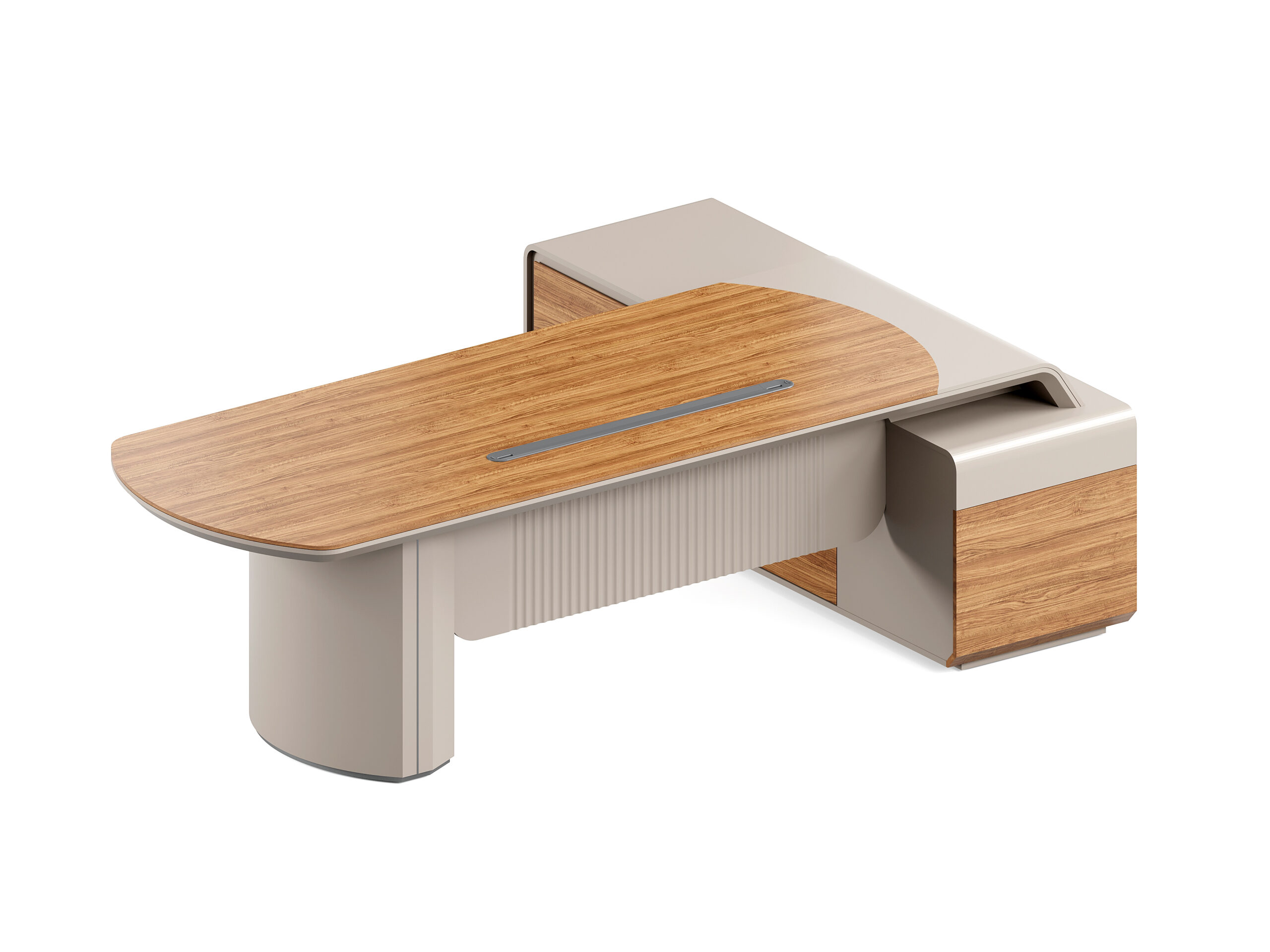 שולחן מנהלים דגם PRESTIGE בעיצוב מודרני ומרשים, משלב עץ חמים עם גוף בגימור אפור חלק ליצירת מראה יוקרתי ומקצועי. השולחן כולל יחידת אחסון צדדית ופתרונות עבודה נוחים המתאימים למשרדים, חדרי ישיבות ולחללי עבודה פרטיים.מידות זמינות